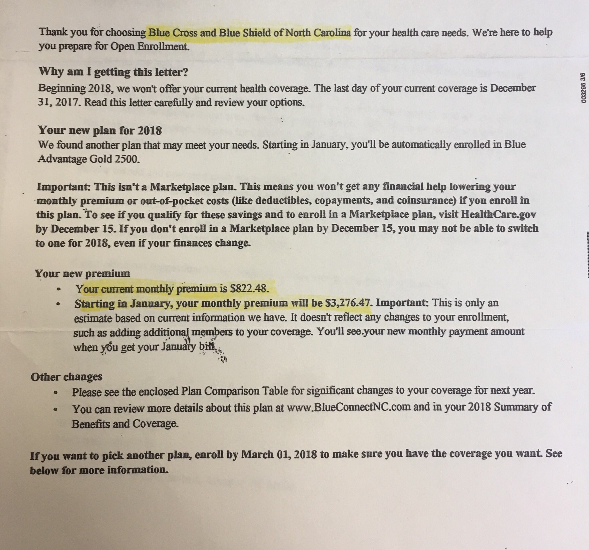 "Your current monthly premium is $822.48. Starting in January, your monthly premium will be $3,276.47"